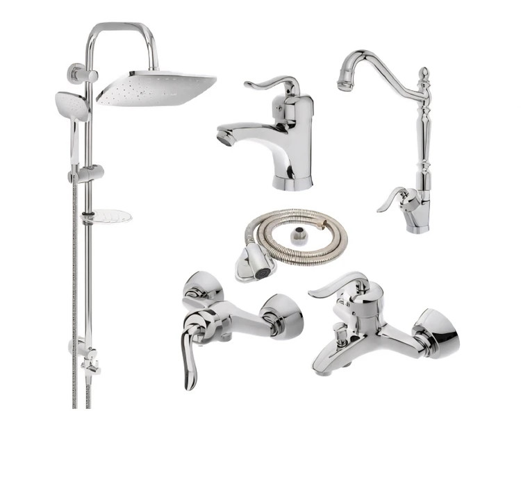 ست شش عددی شیرآلات مدل قاجاری به همراه علم دوش دوکاره رسوبگیر اتومات شامل یک ست شیرآلات بهداشتی مدل قاجاری، یک عدد علم دوکاره رسوبگیر اتومات و یک عدد شلنگ توالت