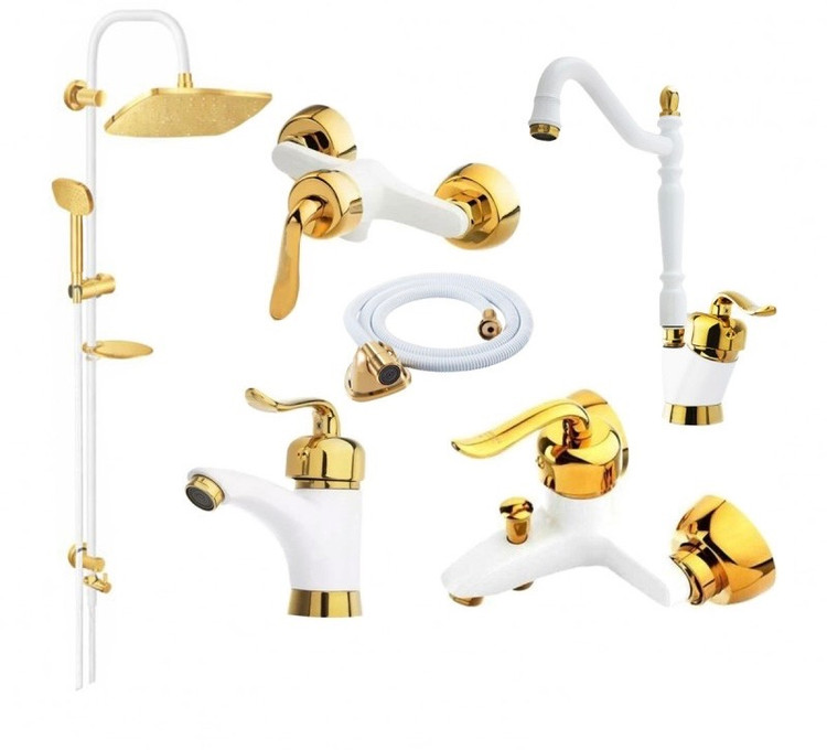 ست شش عددی شیرآلات سفید طلایی مدل قاجاری شامل مجموعه کامل از شیرآلات مورد نیاز در یک ساختمان (شیرهای ظرفشویی، روشویی، توالت، حمام، علم دوش دوکاره رسولگیر اتومات و شلنگ استیل) به همراه تمام لوازم نصب