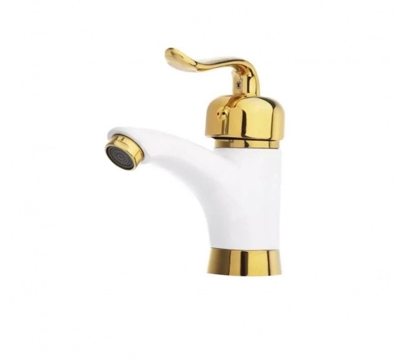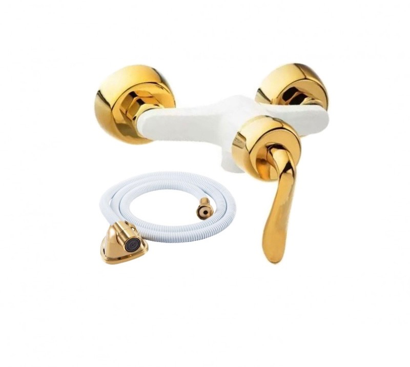 ست شش عددی شیرآلات سفید طلایی مدل قاجاری شامل مجموعه کامل از شیرآلات مورد نیاز در یک ساختمان (شیرهای ظرفشویی، روشویی، توالت، حمام، علم دوش دوکاره رسولگیر اتومات و شلنگ استیل) به همراه تمام لوازم نصب